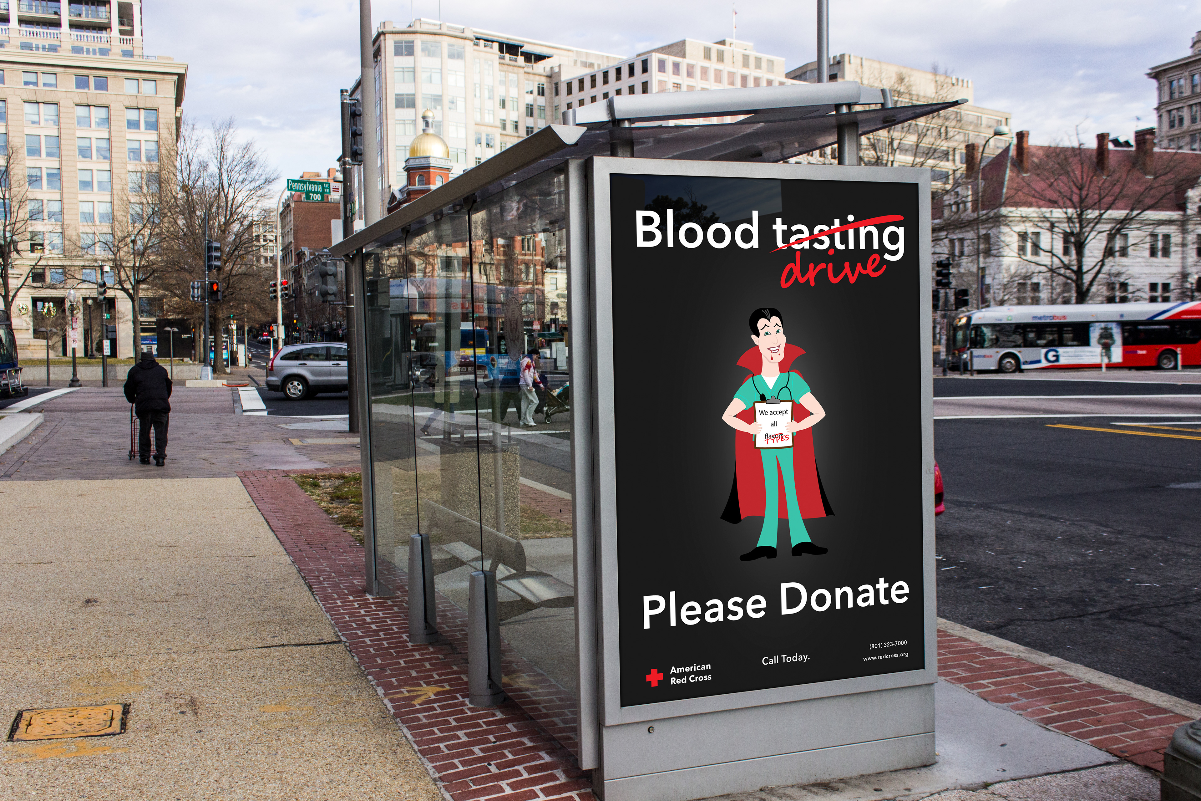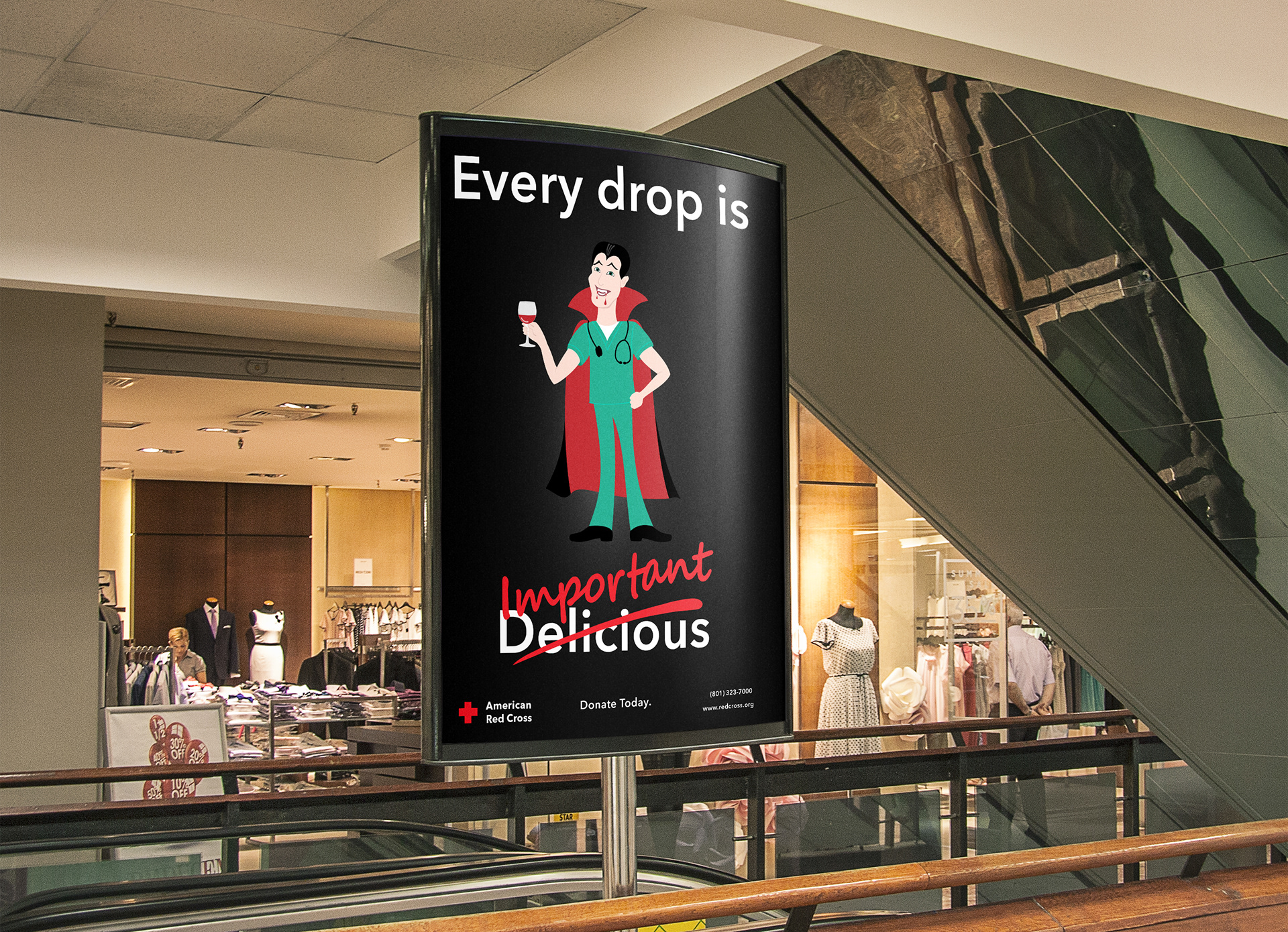 The concept of a nurse who is a vampire was one of those crazy ideas that come up when all the more reasonable ideas in your head have been exhausted. I thought it was funny, but it was fitting too. It got a bigger response from it than I expected. Pushing the boundaries of what people are comfortable with gets their attention. The play on blood donation center workers keeps the viewer thinking for just a moment longer, and they smile at the thought. Maybe it will stick in their minds long enough for them to decide to donate blood.